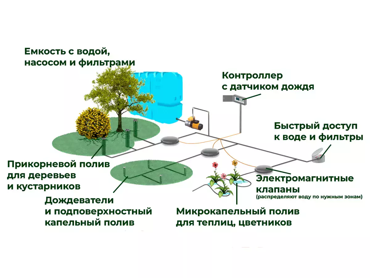 | Датчики влажности почвы для полива | Дождевание для больших садов | Подпочвенный полив деревьев | Монтаж автоматической системы полива | Уход за системой автоматического полива |