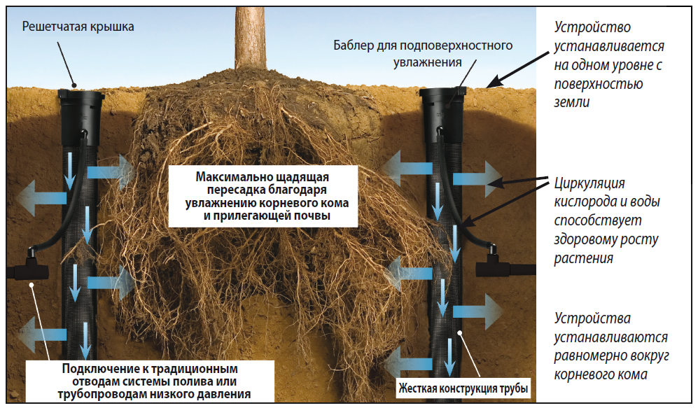 - Подпочвенное орошение: Вода подается под землю, увлажняя корневую зону растений.